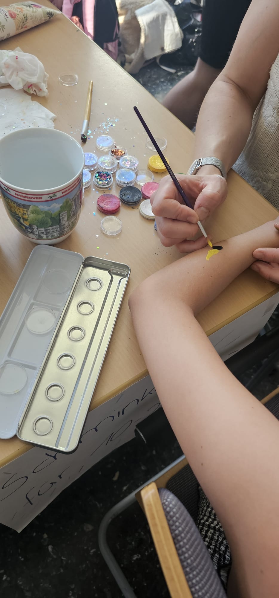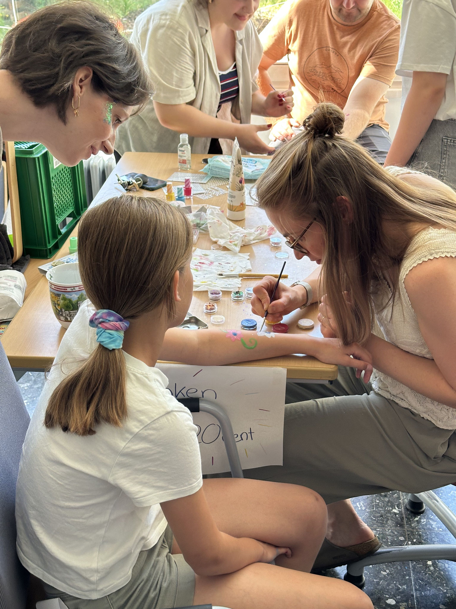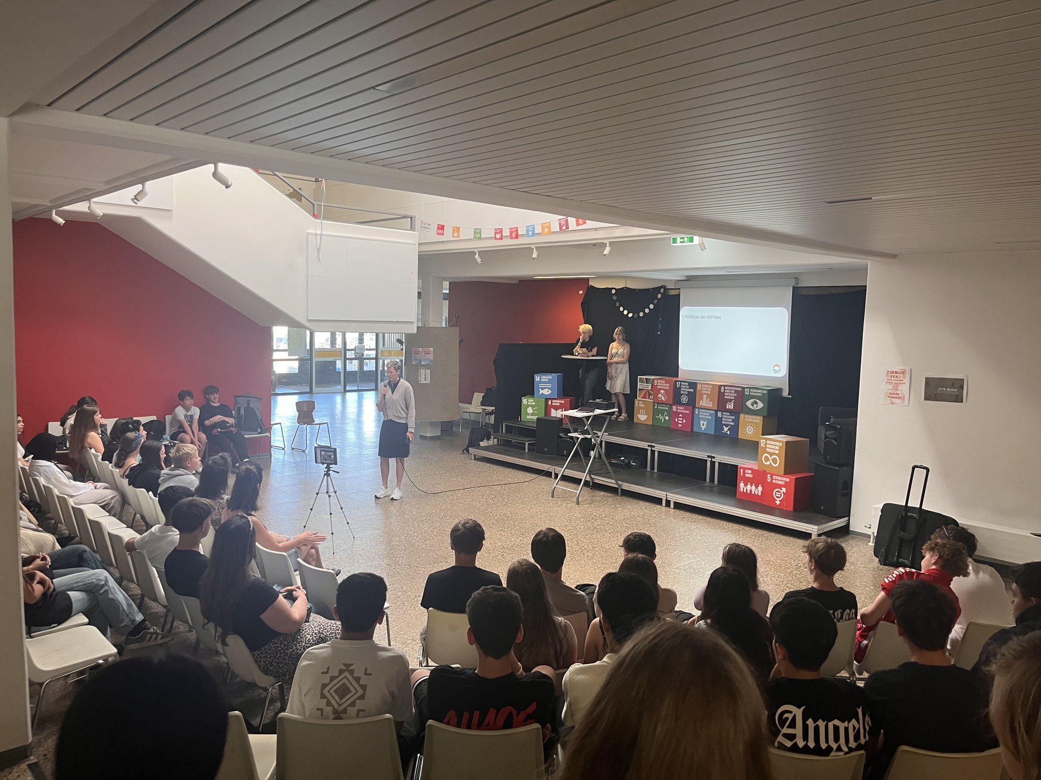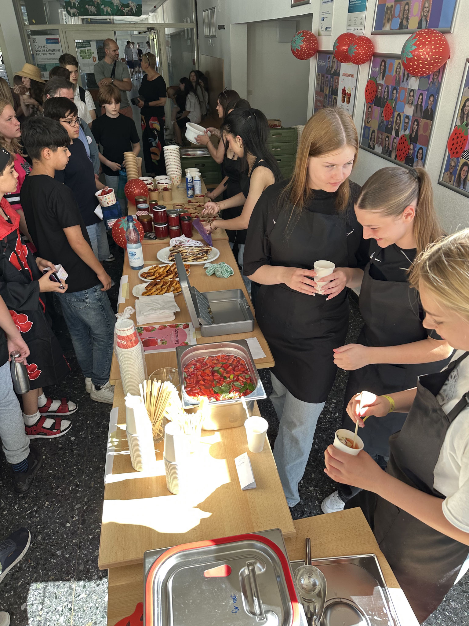 Einige Schüler*innen des 8. und 9. Jahrgangs präsentierten ihre FreiDay-Projekte zu den Themen der Nachhaltigkeitsziele und hatten dafür ein abwechslungsreiches Programm vorbereitet. Es gab Mitmachstationen, Spiele, kreative Aktionen, Infostände, und wer Lust hatte, konnte sich schminken auch schminken lassen. Besonders beliebt waren die frisch gepflückten Erdbeeren vom Erdbeerhof und das Wassereis, welches im Forum verkauft wurden.